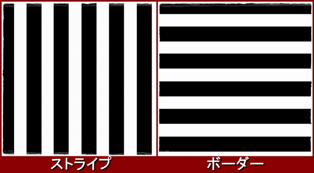 左の縦方向の縞模様を「ストライプ」、右の横方向の縞模様を「ボーダー」と区別しています。