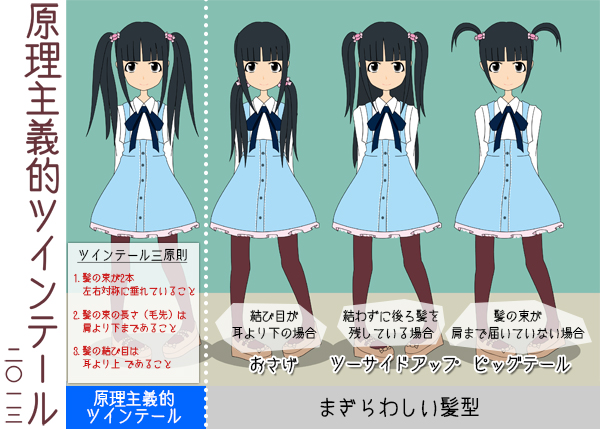 俺の場合は単に↑にもある「後方の髪を全てくくった束が2本、左右に垂れて」いれば、それでツインテだと思ってます(笑)