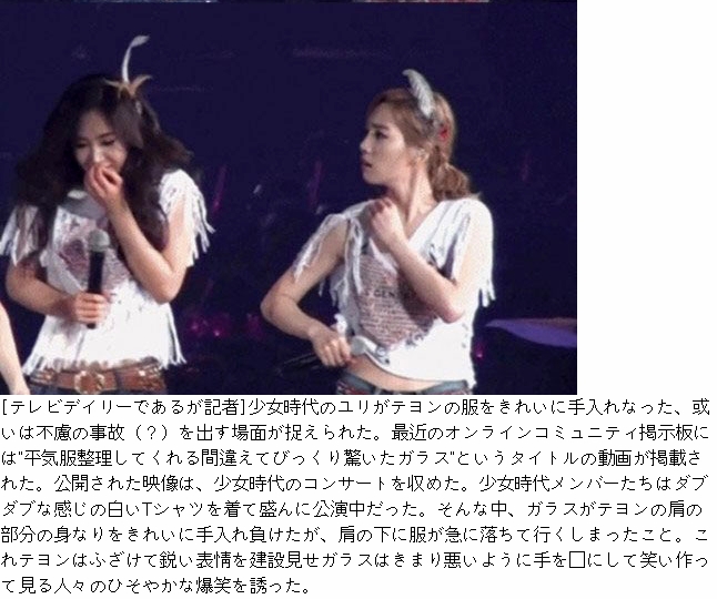 記事内容より画像に笑ってしまうが(笑)、内容を簡単に説明しておくと、ユリがテヨンの服を直そうと肩の部分に触れるが逆にずり落ちてしまい、これに気付いたテヨンがふざけてユリに鋭い表情を見せた・・・。という記事。