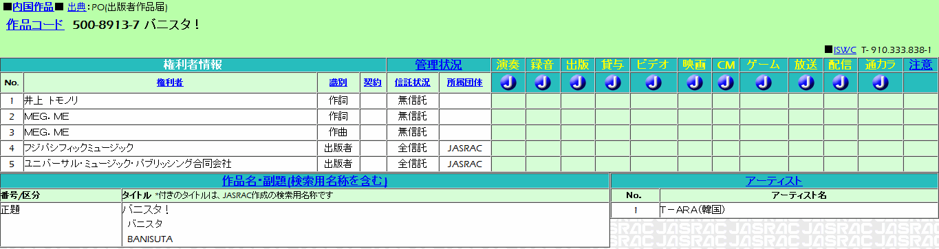 これはJASRACのデータベースに登録されている「バニスタ!」に関する情報です。