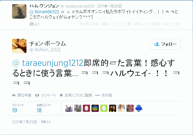 @taraeunjung1212 즉석으ㄹ 지은 단어!! 감탄할때 쓰는 단어...ㅋㅋㅋ 헐웨이-!!!!ㅋㅋㅋ— Jeon Bo Ram (@BoRam_0322) 2011, 7月 29