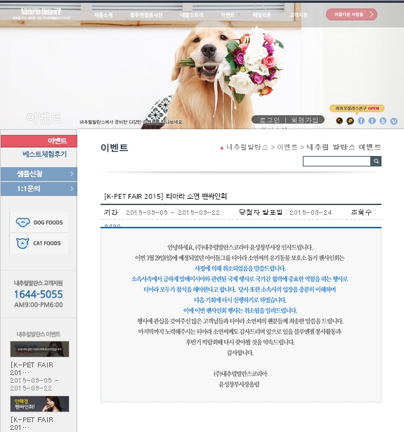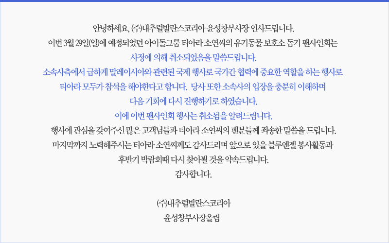 3月29日(日)に予定されていたアイドルグループ ティアラ ソヨンさんの有機動物シェルター(?)支援のファンサイン会は、事情によりキャンセルされたことを申し上げます。