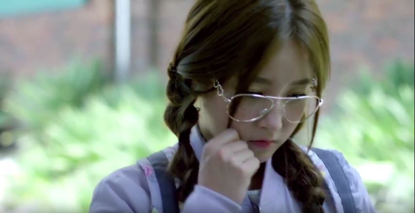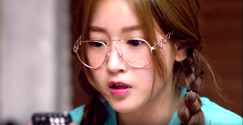 メガネでおさげ髪、そして冴えない表情の女性(ソヨン)。