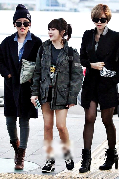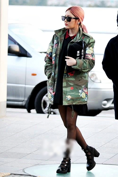 ソヨンはチェスター・コートにデニム・シャツとデニム・パンツ(デニデニ!)、そしてブラウンのレースアップ・ブーツとミリタリー要素が無いぞ・・・?と思いきや、クラッチ・バッグがカモ柄(笑)