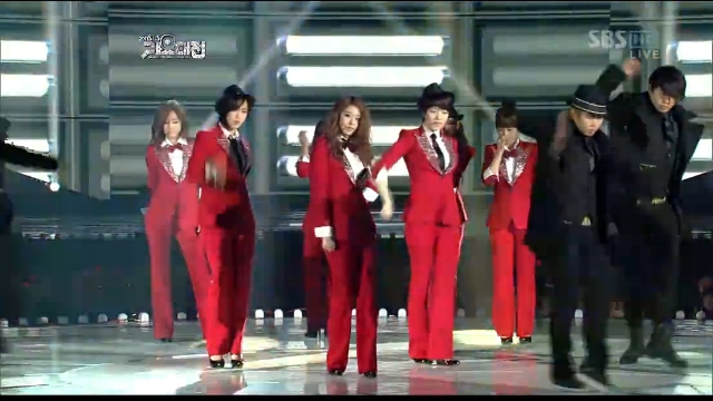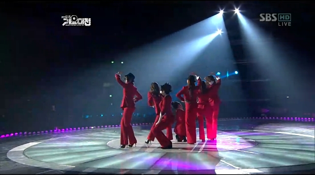 メンバーはラペルがシルバーのラメで散りばめられた真っ赤なスーツを身にまとい登場!