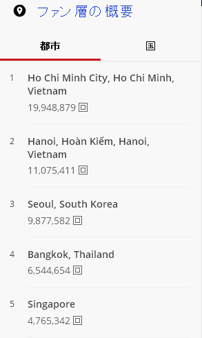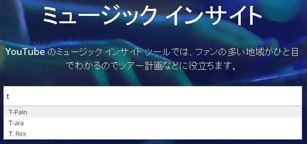 コレは何なのかというと、気になるアーティストの動画の総再生回数や、どの地域(都市別、国別)からの再生が多いのか、そしてどの動画が多く再生されているのかがわかるという、何気にマニアックな情報を収集できるコンテンツなのであります。