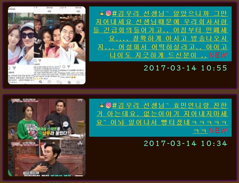 「キム・ウリ先生。ヒョミン(T-ARAメンバー)オンニ(=年上の女性に対して使う言葉)と仲が良いことは知っていますが。ありもしない話を作り出さないでください。(キム・ウリ=T-ARA6人組時代のスタイリスト)起きて爆笑したよ」とインスタで反論。