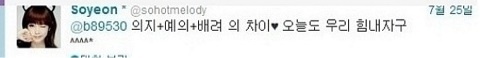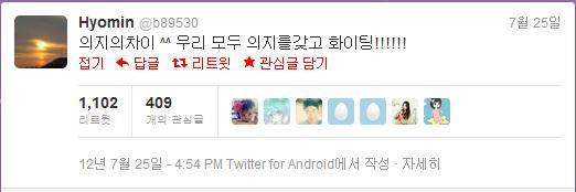 今思えば、ヒョミンの顔文字「^^」、ソヨンのハートマーク「?」なんかはあまりキツい感じにしたくなかった配慮からだと思うし(確率的には少ないかな^^;)、ウンジョンもファヨンに気付いてもらいたくてヒョミンのツイートをリツイートしたのだと思うし・・・。